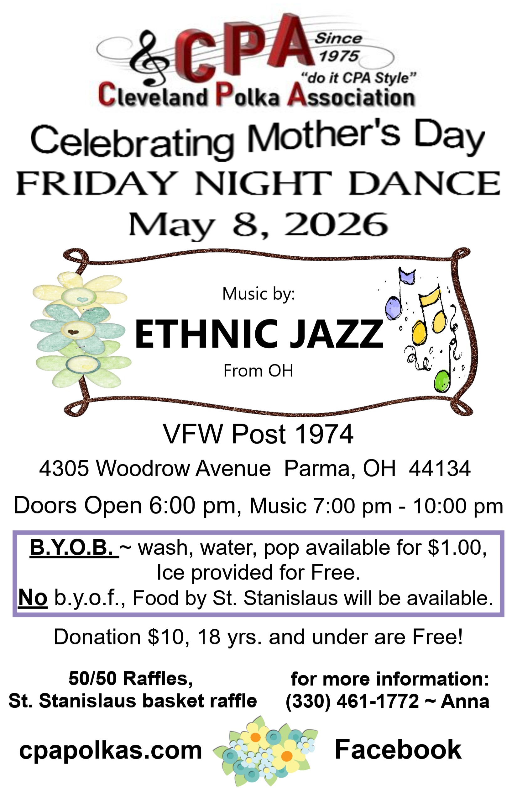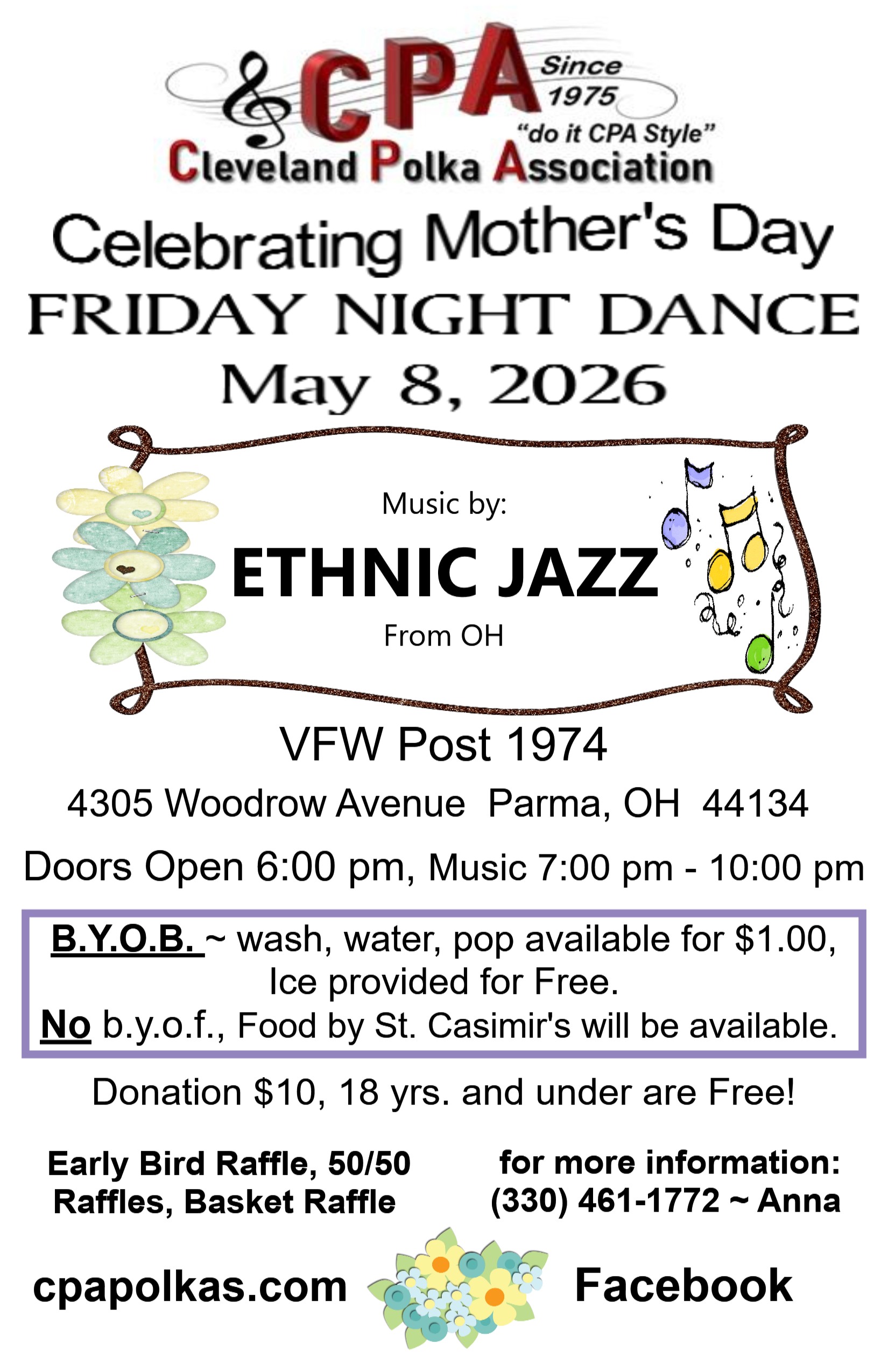 05/08/2026 | Fri | Ethnic Jazz from OH | Lake Erie VFW | 7-10, pm | Friday Night BYOB |