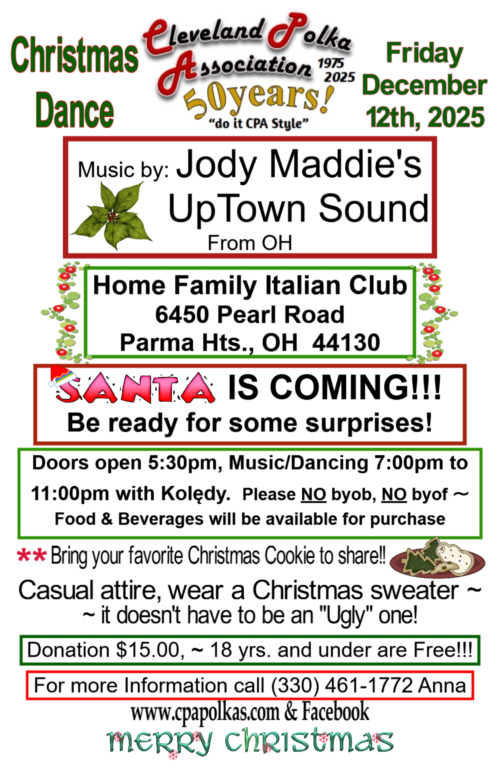 12/12/2025 | Fri | Jody Maddie's UpTown Sound | Home Family Club | TBD | Christmas Party Dance |