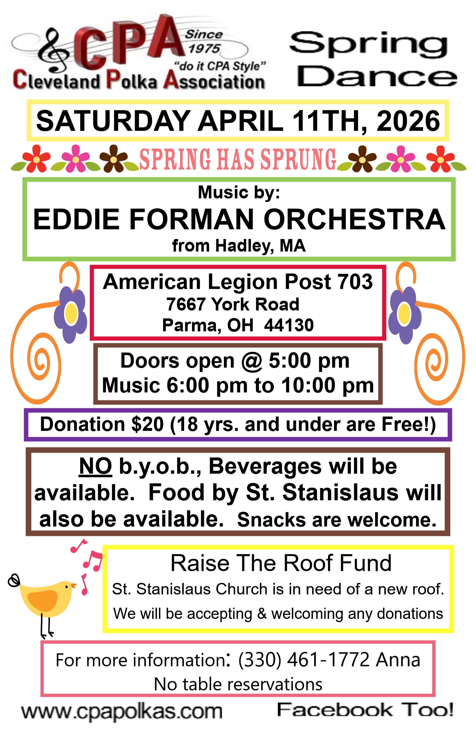 04/11/2026 | Sat | Eddie Forman Orchestra | American Legion Hall | 6-10, pm | Spring Dance |
