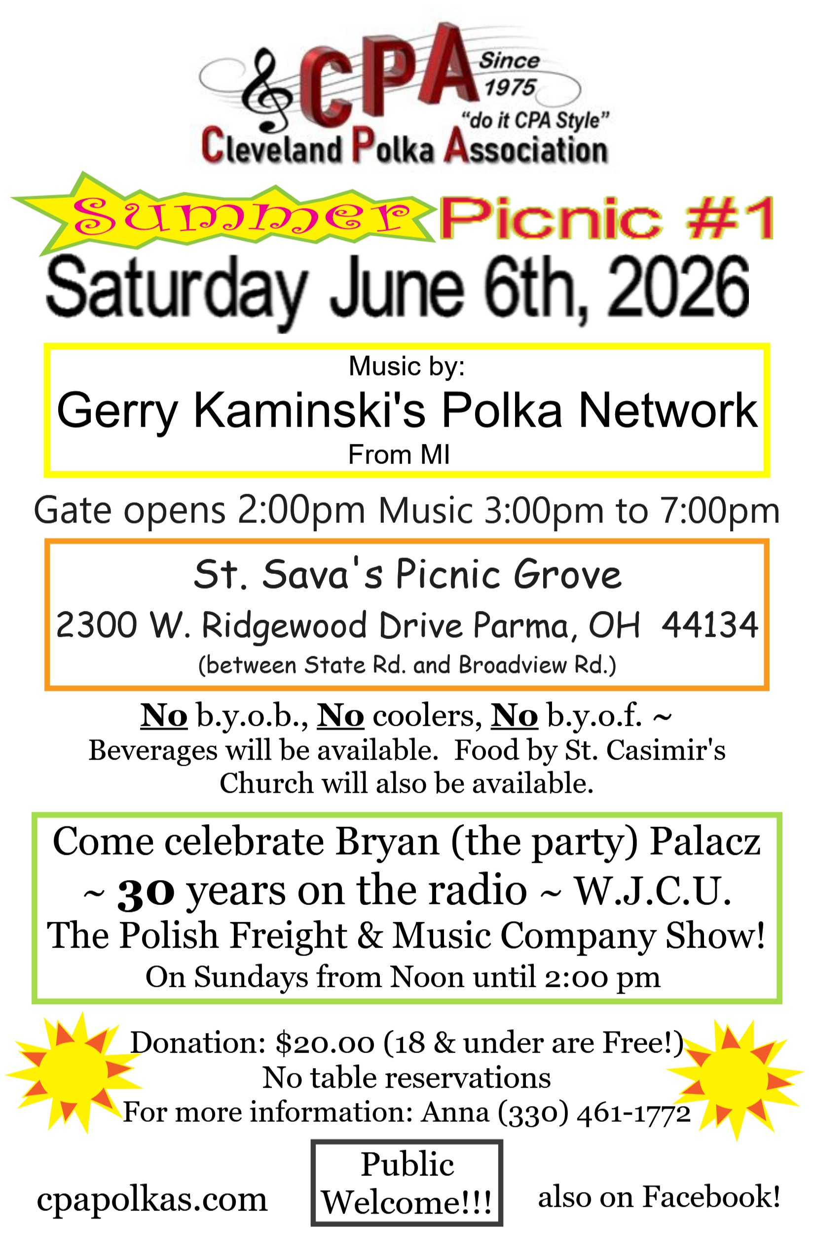 06/06/2026 | Sat | Gerry Kaminski's Polka Network from MI | St. Sava's Picnic Grove | 3-7, pm | June Summer Picnic |